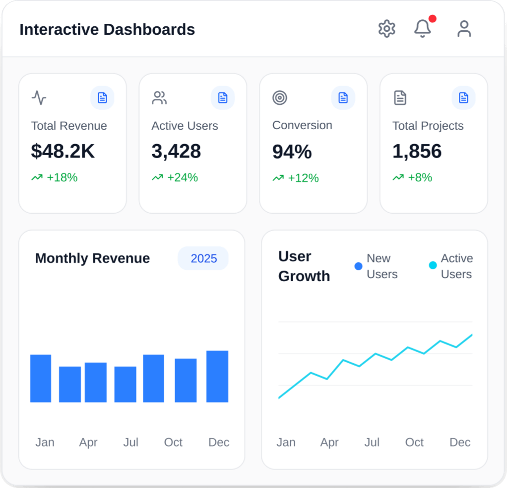Visualize your entire business with customizable dashboards and interactive charts. Track KPIs, monitor trends, and uncover insights with AI-powered analytics that turn your data into actionable intelligence.